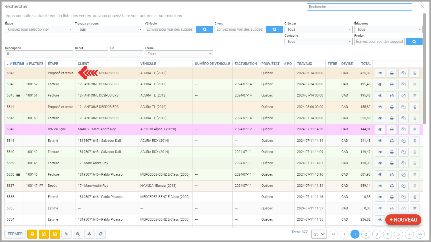 Cliquez sur la loupe pour obtenir les ventes récentes. Vous apercevrez, parmi les plus récentes ventes, l'estimé des travaux proposés et remis.