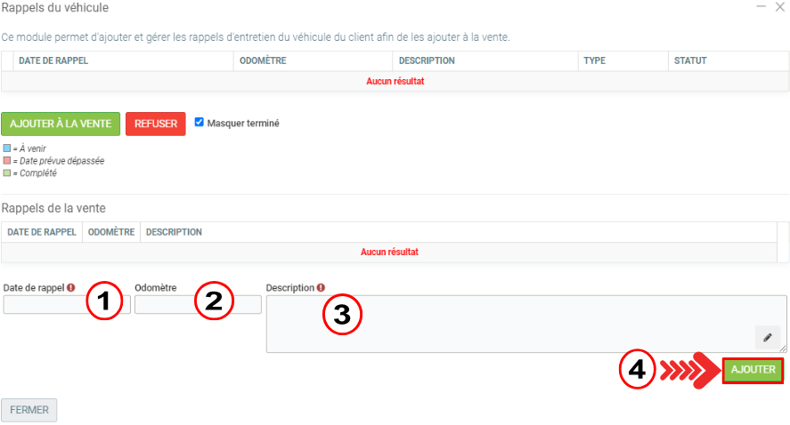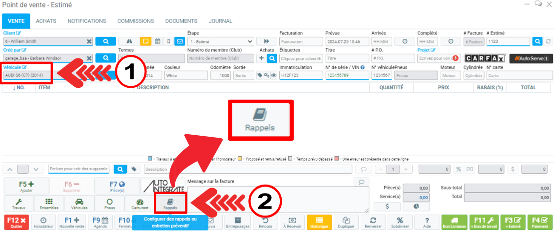À partir du Point de vente, une fois un véhicule ajouté, observez le bouton Rappels situé dans le menu au bas de l'écran.