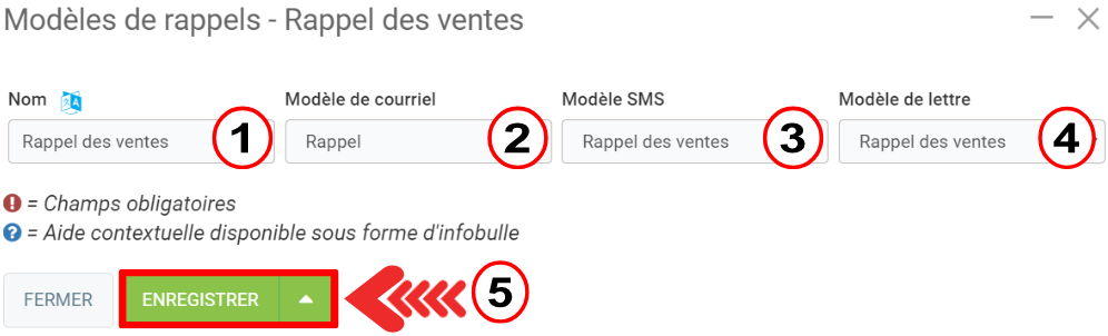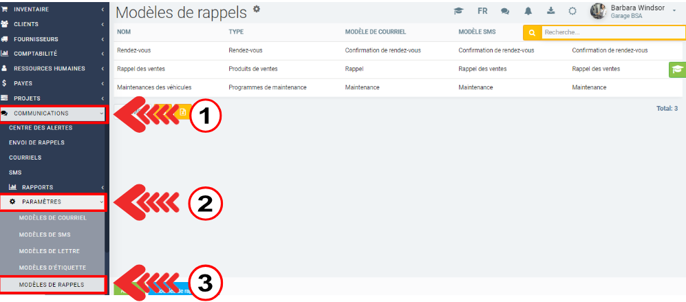 Pour voir la liste des rappels, cliquez sur Communications > Configurations > Modèles de rappels.