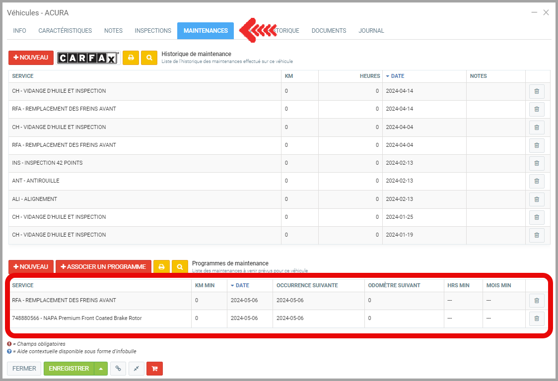 Notez que vous pouvez également consulter les rappels du véhicule sous l'onglet Maintenance du dossier du véhicule.
