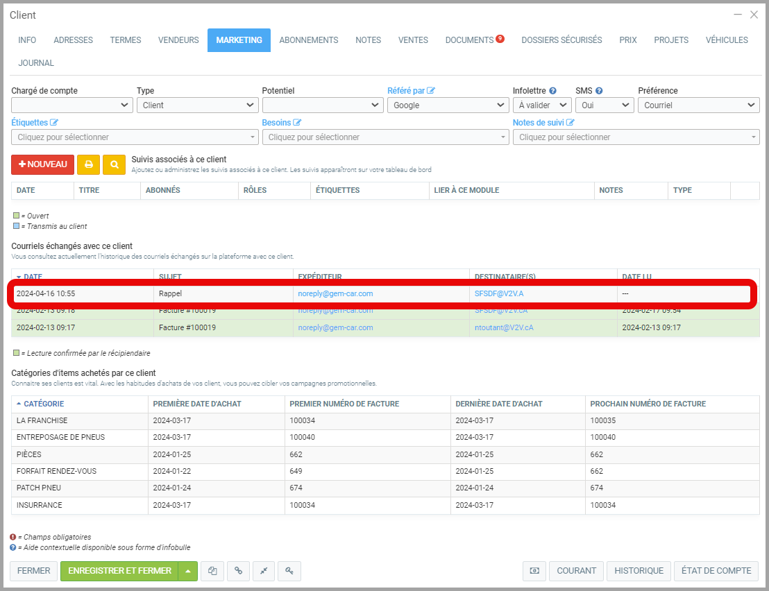 Dans le dossier du client, il est également possible de voir le message de rappel qui a été envoyé au client sous l'onglet Marketing.