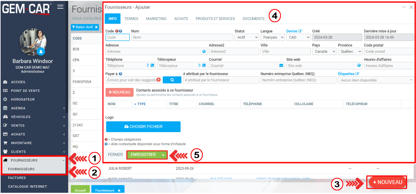 Cliquer sur Fournisseurs > Fournisseurs > +Nouveau.