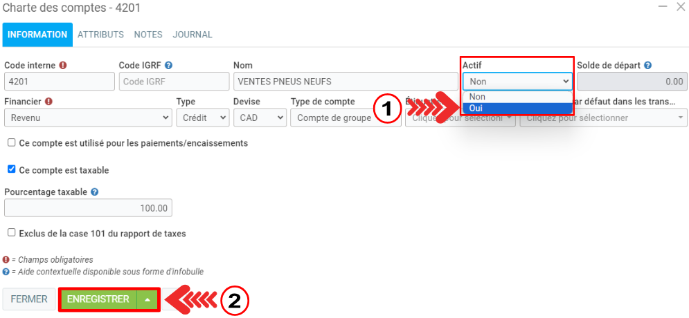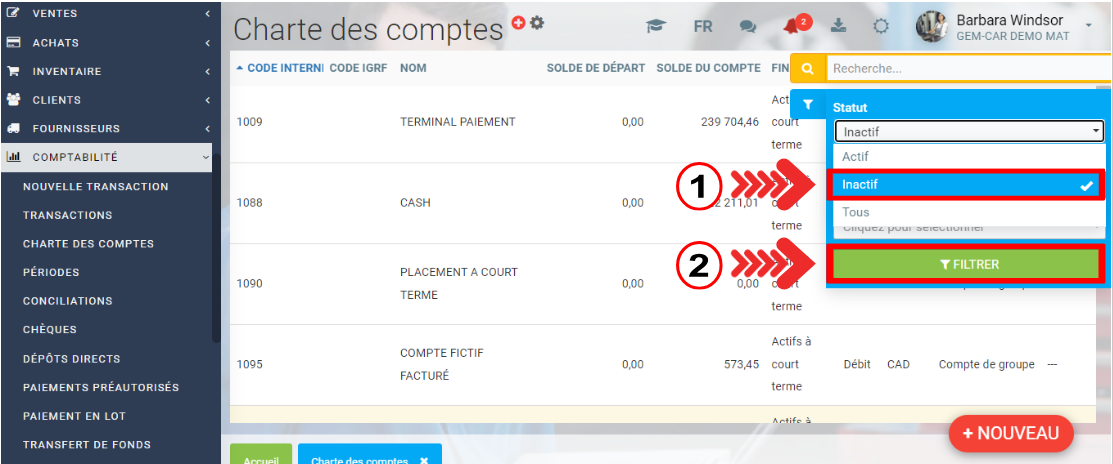 Pour activer un compte inactif, cliquez sur Comptabilité > Charte des comptes.