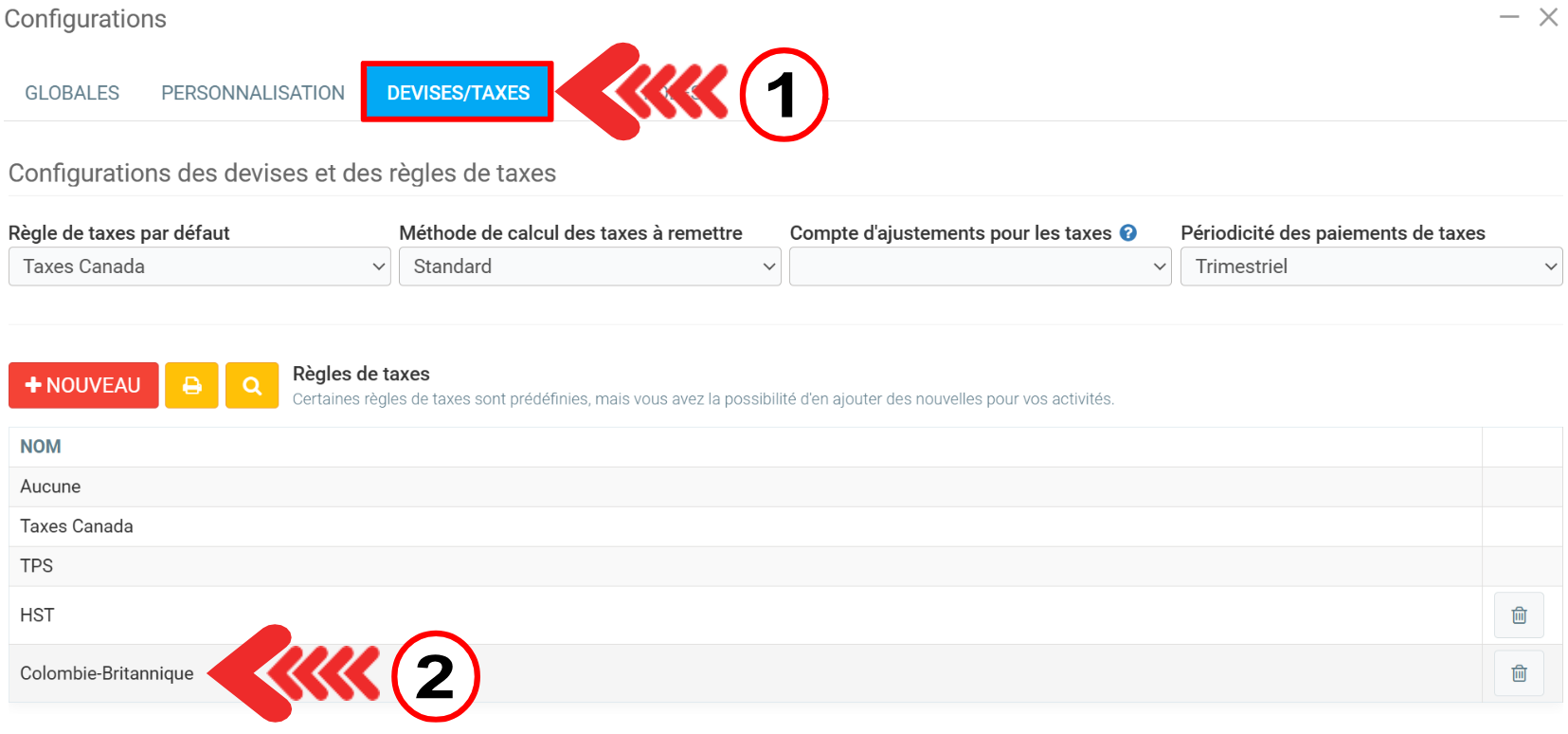 Pour vérifier les taxes, cliquez sur Paramètres > Configurations > onglet Devises/ Taxes > +Nouveau pour ajouter une nouvelle Règles de taxes.