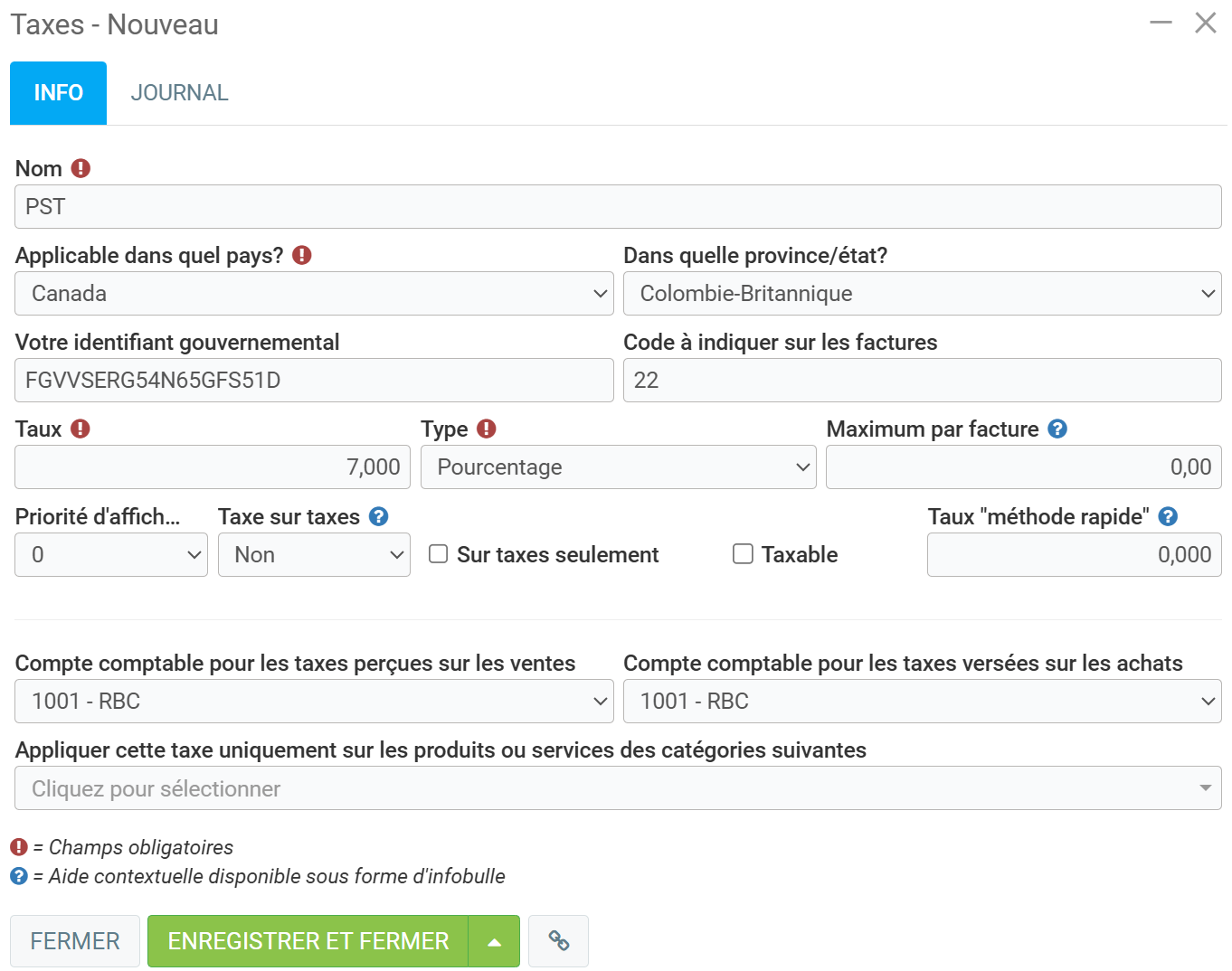 Vous pouvez saisir une nouvelle taxe et y inclure les taxes en vigueur dans la province concernée. Dans le cas de la Colombie-Britannique, il s'agit de la TPS et de la TVP.