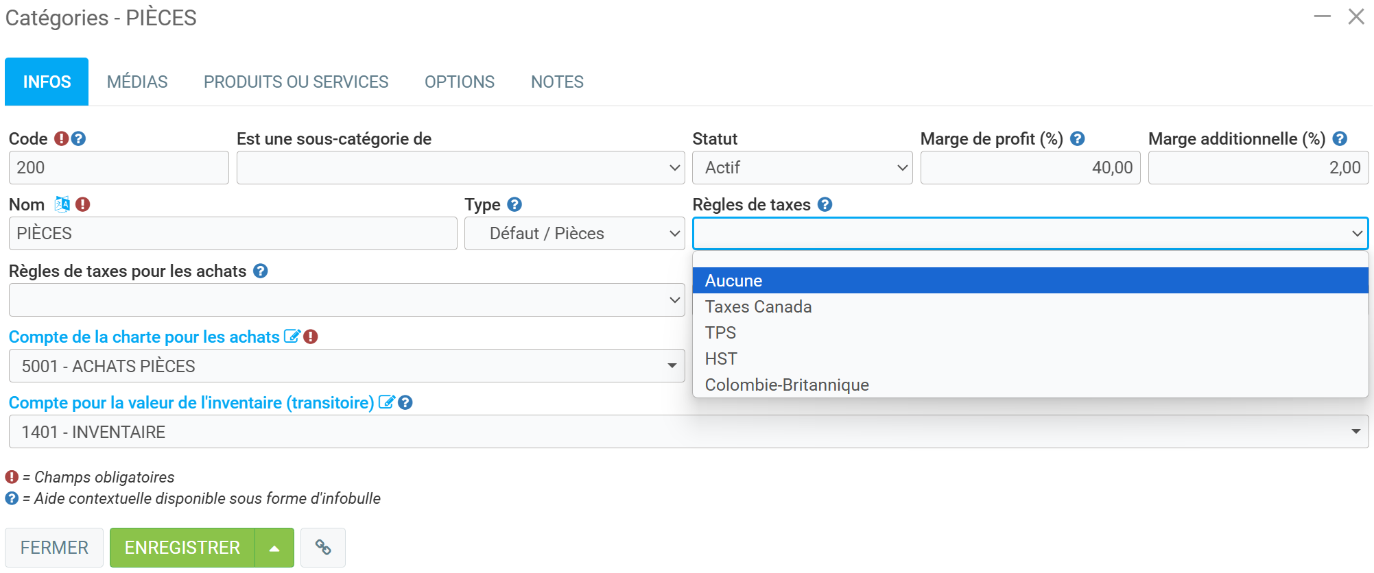 Si vous voulez spécifier vos numéros de taxes, cliquez sur les taxes canadiennes. Si vous avez le module Transporteur, Courtier ou Messager, vous devrez faire la même chose dans "Taxes Canada - Transport de marchandises" et "Taxes Canada - Transport de marchandises au Québec".