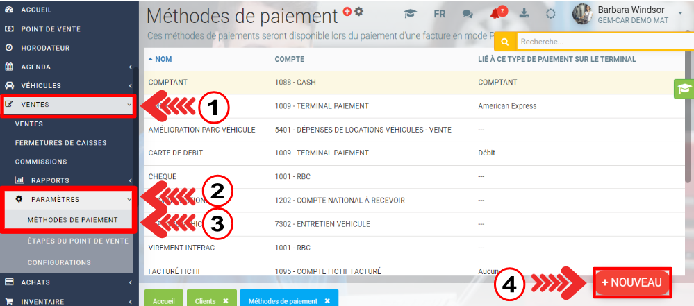 Allez dans le menu Ventes > Paramètres > Méthodes de paiement > +Nouveau.