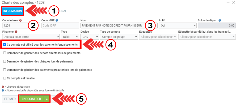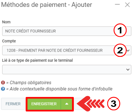 Créer le mode de paiement: Note crédit Fournisseur, et lien vers le compte GL "1208 Paiement par note de crédit fournisseur". Voir plus sur Charte de comptes.