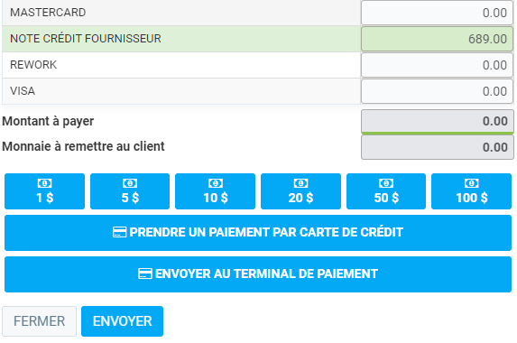 Choisissez la Note crédit fournisseur comme moyen de paiement et appuyez sur Envoyer.