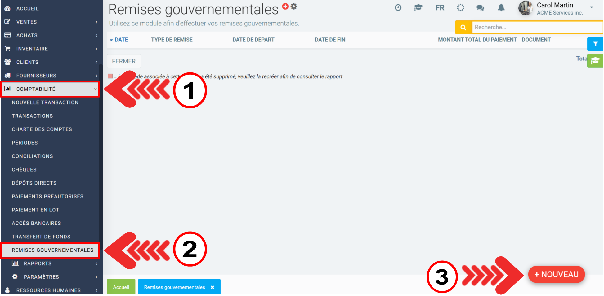 Dans le menu Comptabilité > Remises gouvernementales. Cliquez sur le bouton rouge +Nouveau.