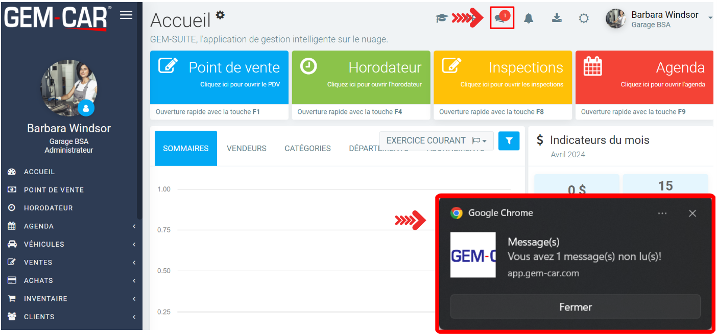 Lorsque vous utilisez la version en ligne, si vous recevez des messages de clients ou d'employés, une petite puce rouge indiquant le nombre de messages apparaît dans le coin supérieur droit de l'écran de connexion.