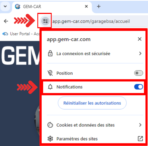À côté de l'adresse du site web, cliquez sur le bouton de paramètres.