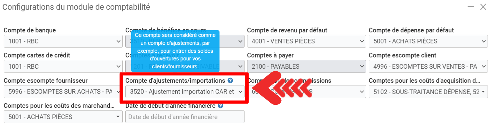 Sur la page Configurations du module de comptabilité, voir le compte 3520 - Ajustement importation CAR et CAP dans la fenêtre Compte d'ajustements/importations.