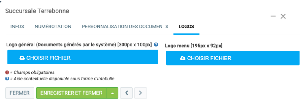 Téléverser votre logo dans les sections Logo général (Documents générés par le système) [proportion suggérée 300px x 100px] et Logo menu [proportion suggérée 195px x 92px].