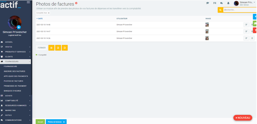 Vous pouvez également accéder au module Photos de factures en cliquant sur Fournisseurs > Photos de factures dans le menu de gauche. Pour ajouter des photos à partir de cette page, cliquez sur le bouton rouge +Nouveau.