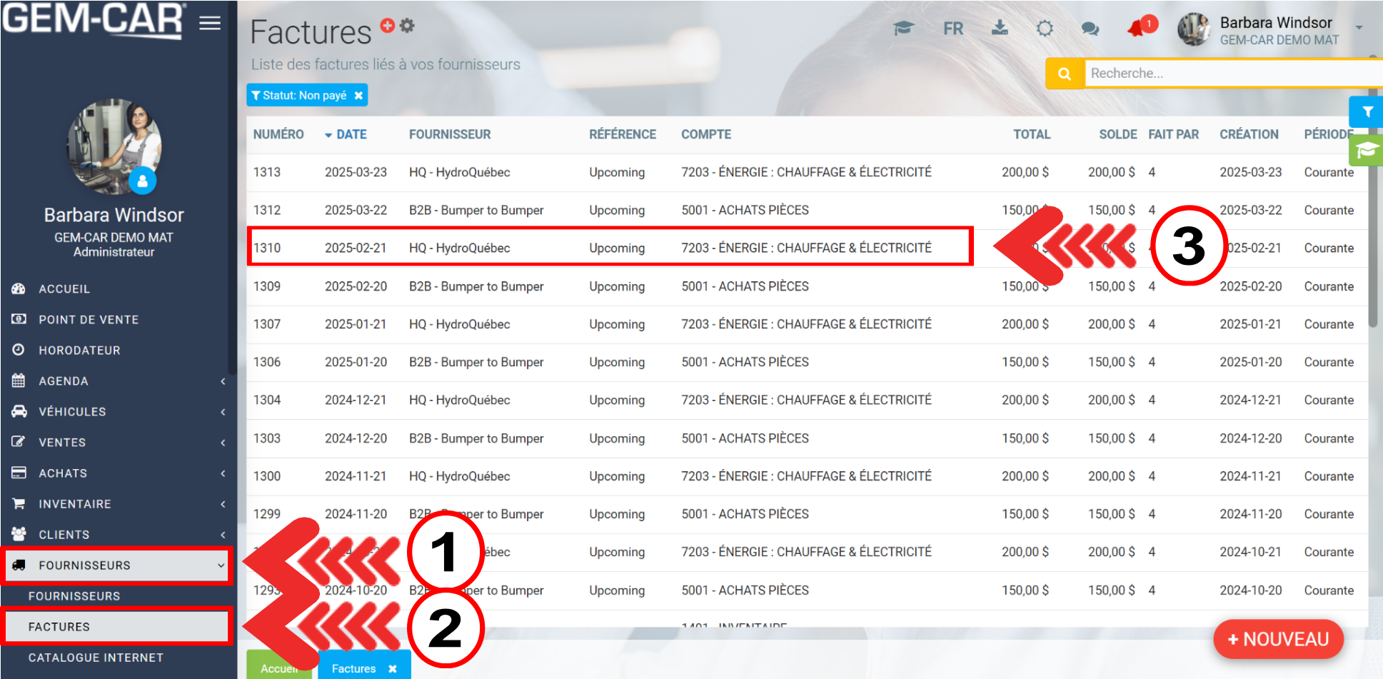 À partir du menu principal situé à gauche de l'application, cliquez sur Fournisseurs > Factures > +Nouveau.