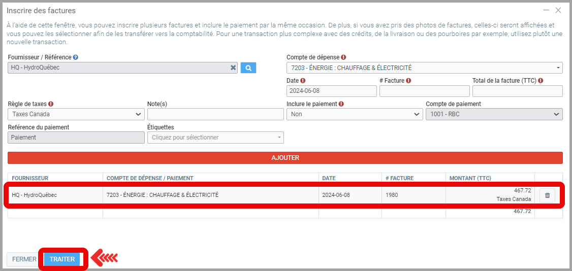 Lorsque vous avez complété la saisie de vos factures, cliquez sur Traiter.