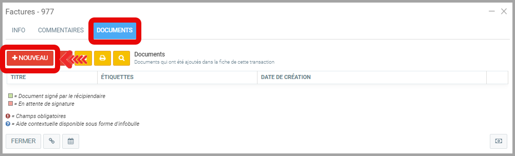 Une fois votre facture ouverte, sous l'onglet Documents, cliquez sur +Nouveau.