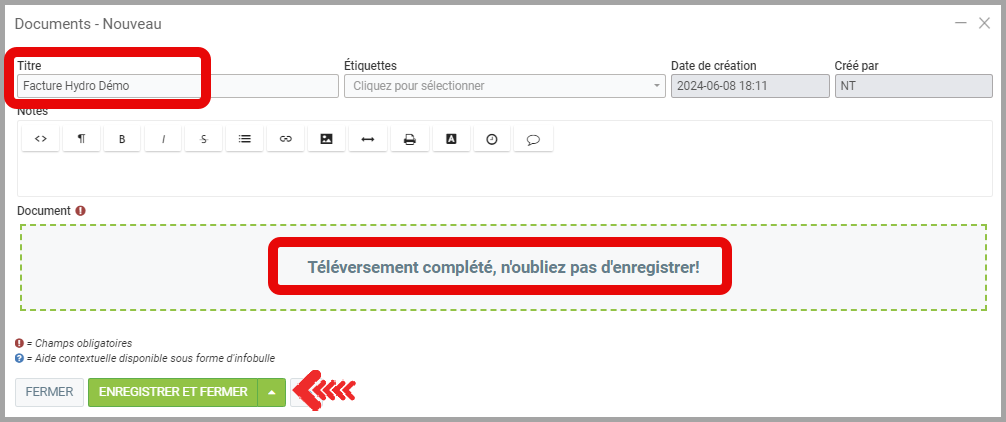Lorsque le téléchargement du document vers GEM-CAR est terminé, la fenêtre indiquera Téléversement complété, n'oubliez pas d'enregistrer!