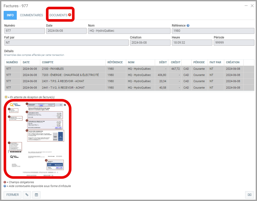 En ouvrant la facture à nouveau, l'image du document que vous avez téléversé se trouvera au bas de la fenêtre.