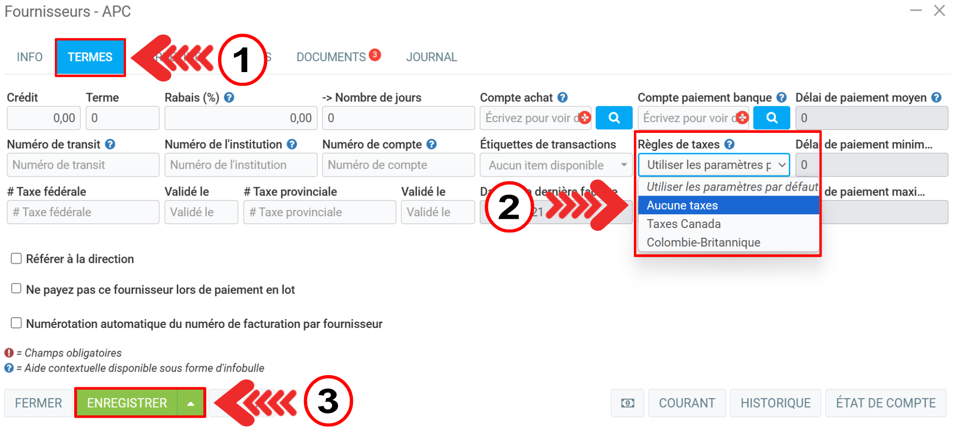 Cliquez sur Termes > Règles de taxes et choisissez "Aucune taxes".