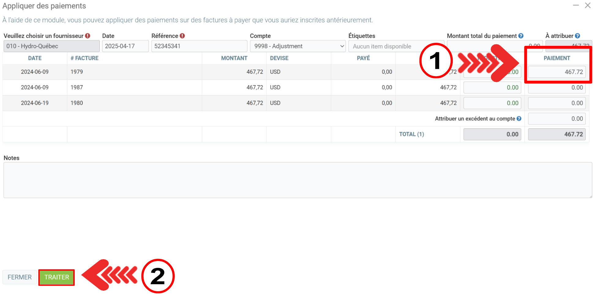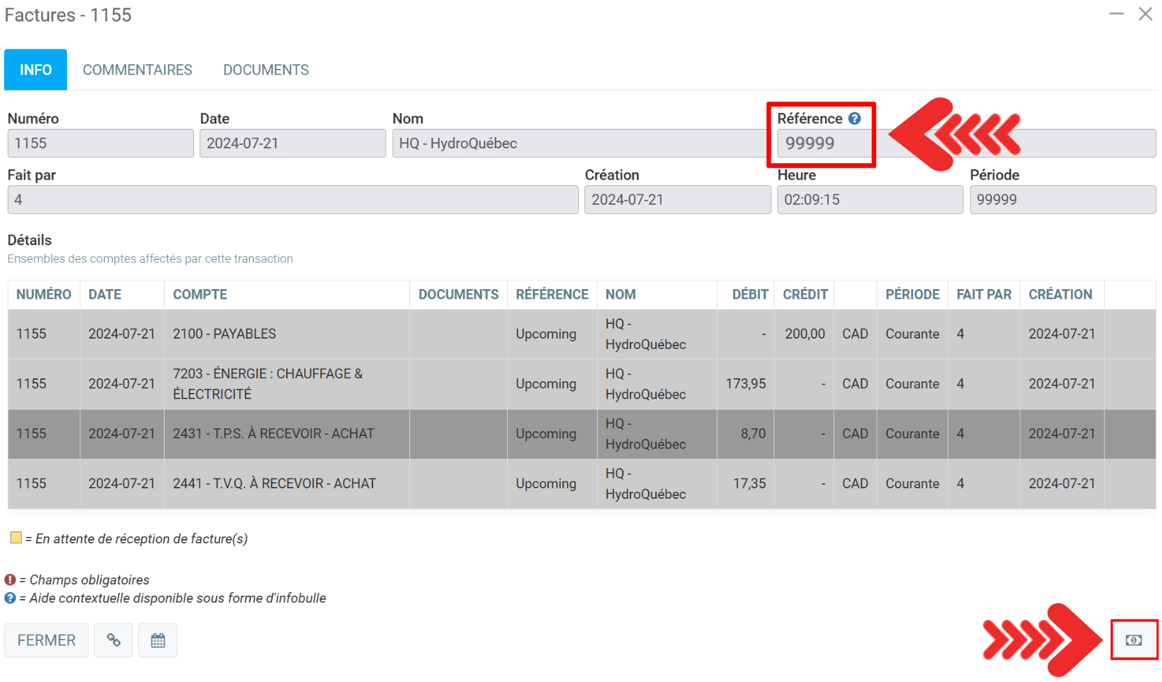 Pour procéder au Paiement par chèque, prenez bien note du numéro de Référence de la facture et cliquez sur le bouton de paiement situé en bas à gauche de la fenêtre de la facture.