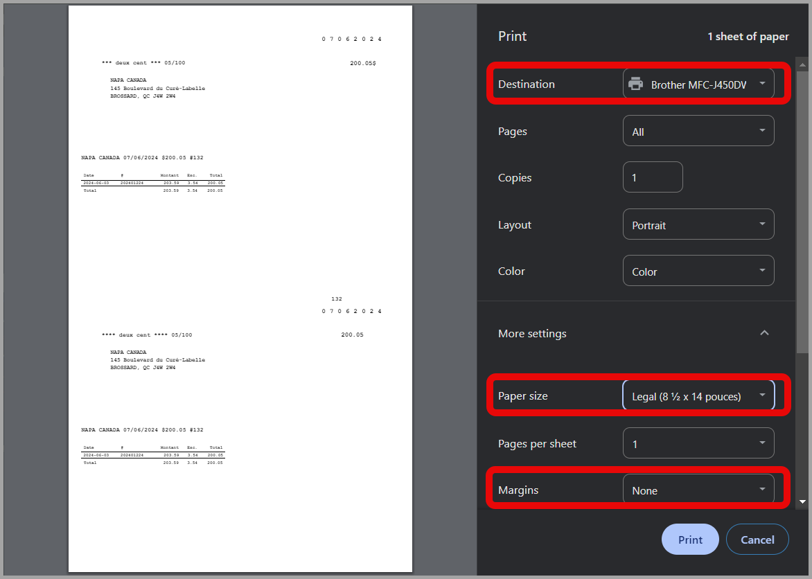 Sélectionnez ensuite vos options d'impression: imprimante, taille du papier, etc. Lorsque vous faites une impression de chèques, si votre navigateur ajoute des marges à l'impression, assurez-vous de cocher l'option Aucune marge avant d'imprimer.