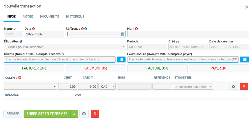 À partir du menu principal situé à gauche de l'application, cliquez sur Comptabilité > Transactions > +Nouveau.