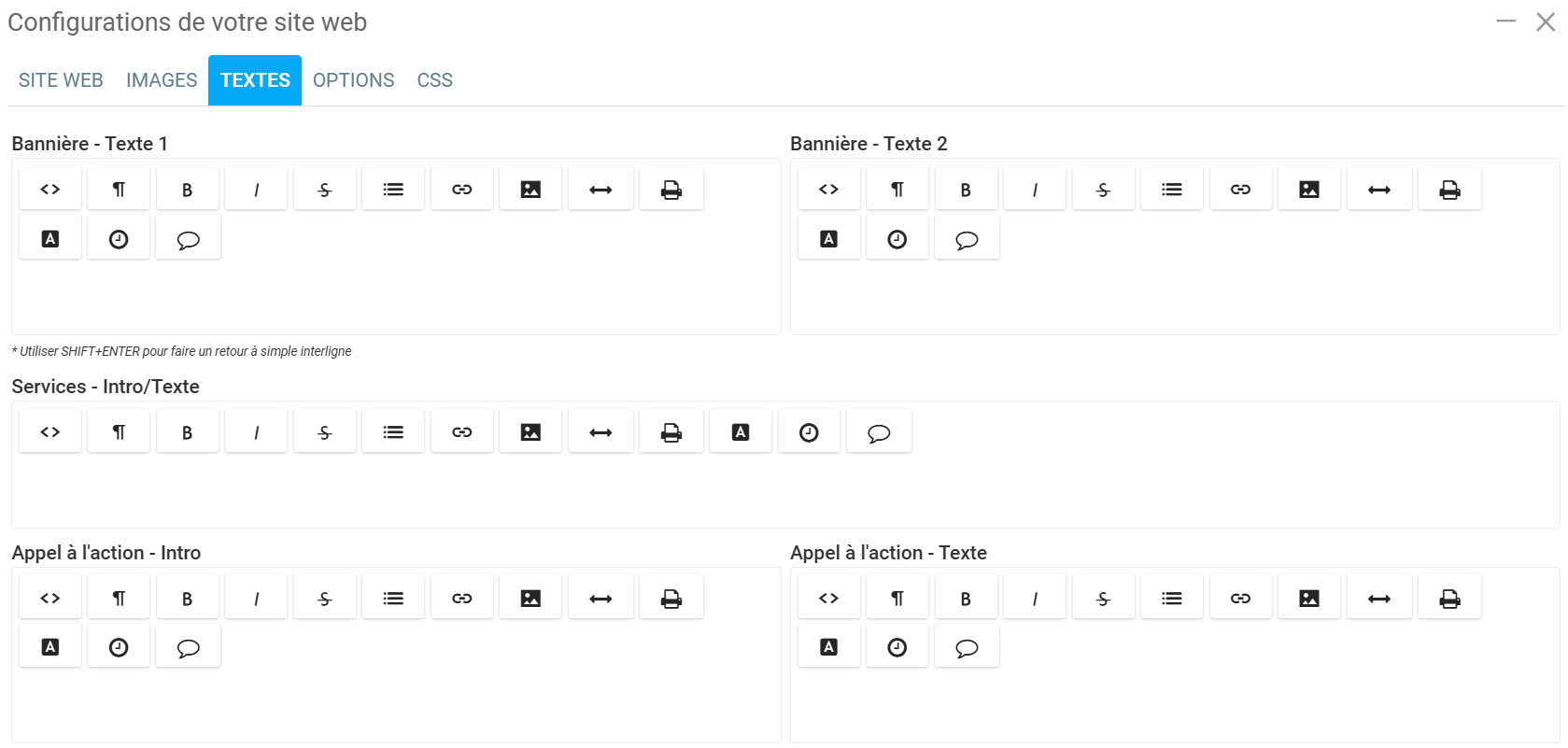 Dans l'onglet Textes, vous disposerez d'un espace pour écrire sur chaque image que vous avez téléchargée dans l'onglet Images et vous pourrez inclure des informations plus importantes sur votre entreprise :