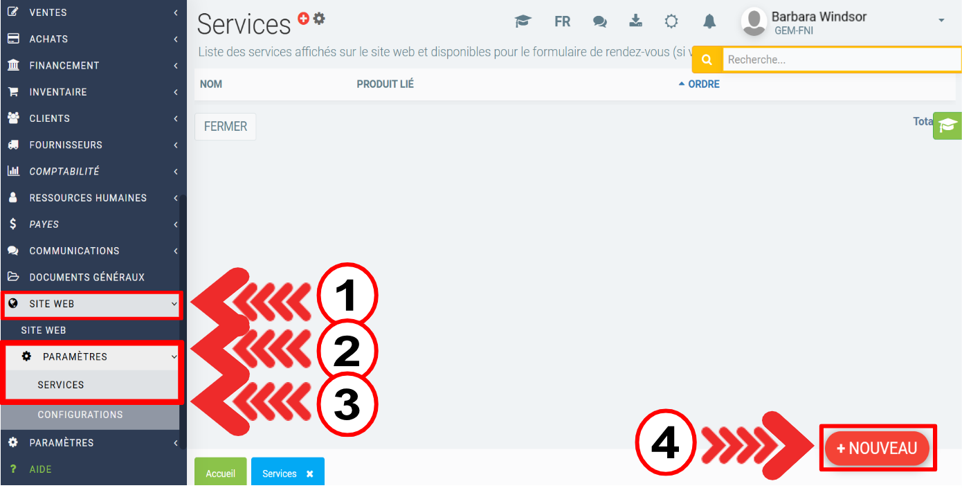 Pour créer une liste de services offerts par votre entreprise qui sera affichée sur le site web et mise à disposition pour le formulaire de rendez-vous (si votre configuration le permet), vous devez cliquer sur Site web > Configurations > Services > +Nouveau.