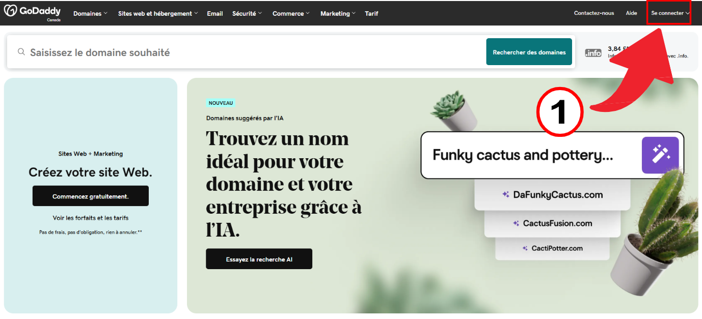 Connectez-vous d'abord à votre compte GoDaddy. Cliquez sur Se connecter dans le coin supérieur droit de l'écran.