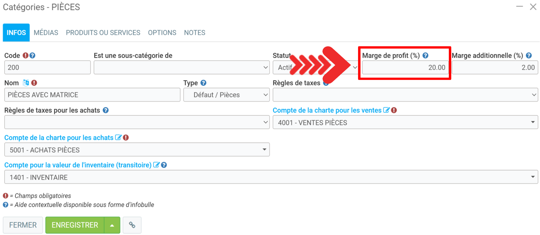 Dans la fenêtre suivante, sous l'onglet Infos, saisissez la valeur souhaitée dans le champ Marge de profit %, en haut à droite de l'écran.