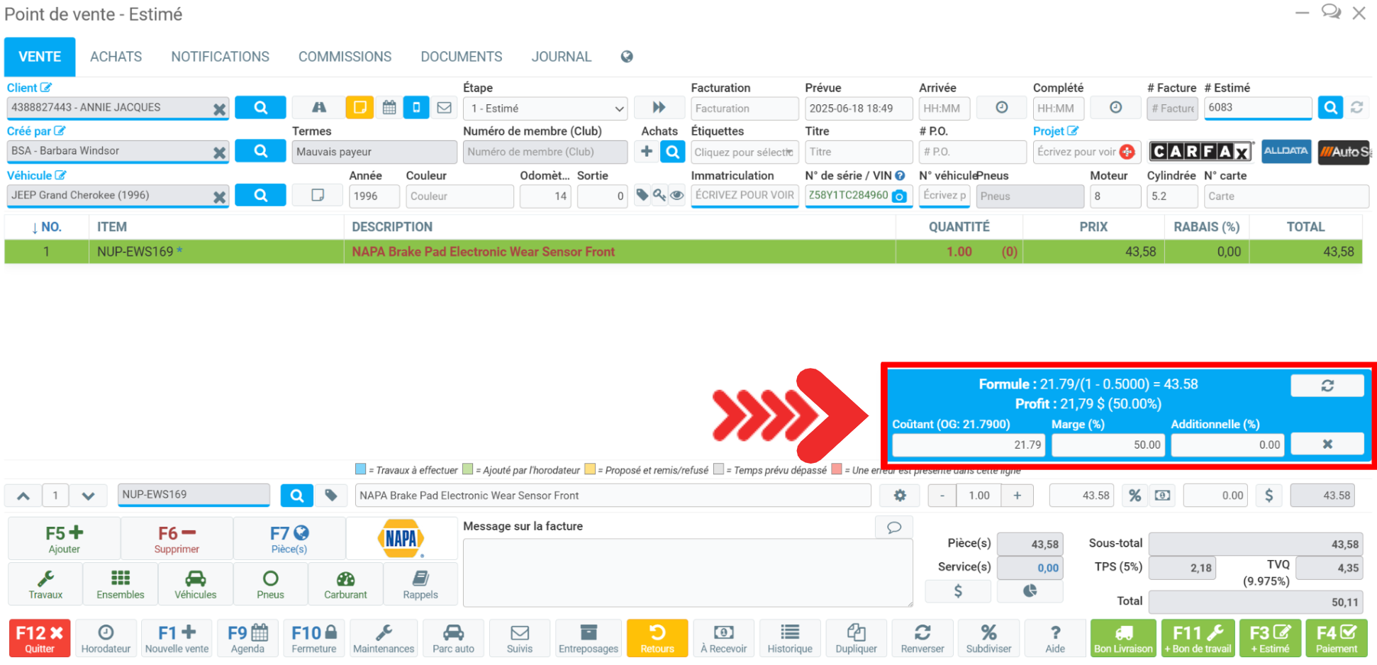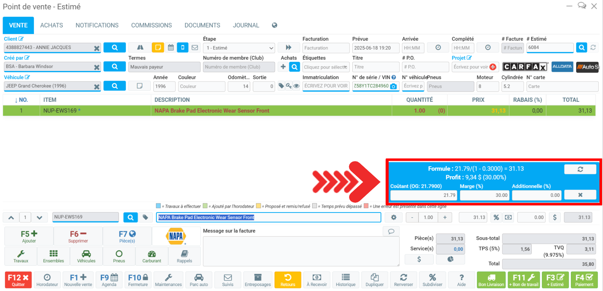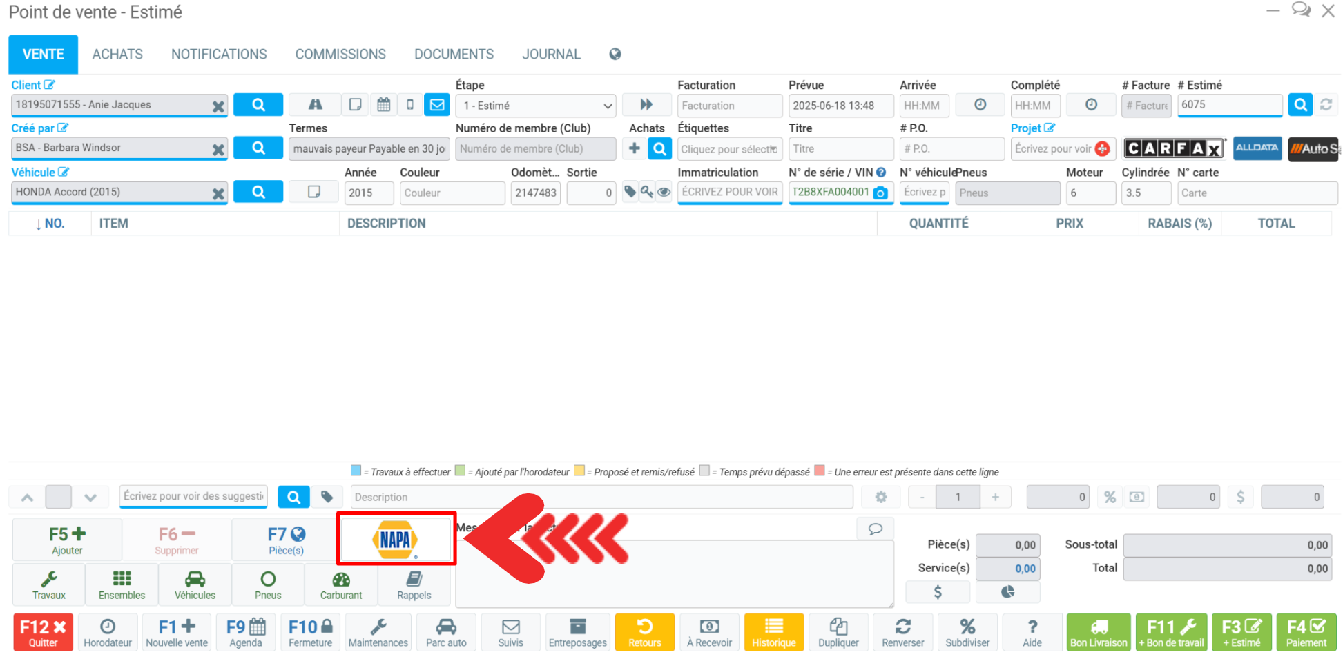 Pour commander une pièce dans une vente, commencez par ouvrir votre Point de vente, sélectionnez le client, les produits et les services, puis cliquez sur le bouton F7 Pièces ou sur le fournisseur par défaut situé à côté de ce bouton.