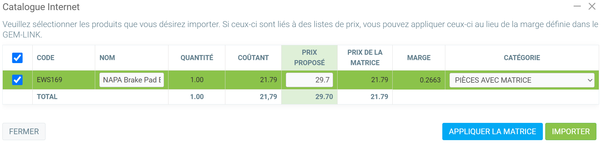 Après avoir sélectionné les produits et les avoir ajoutés à votre panier, si vous appuyez sur le bouton vert Importer sans matrice, le produit sera envoyé au Point de vente avec la valeur offerte par le fournisseur, à partir de la liste de prix figurant sur le site web du fournisseur, sans tenir compte des calculs effectués par GEM-CAR.