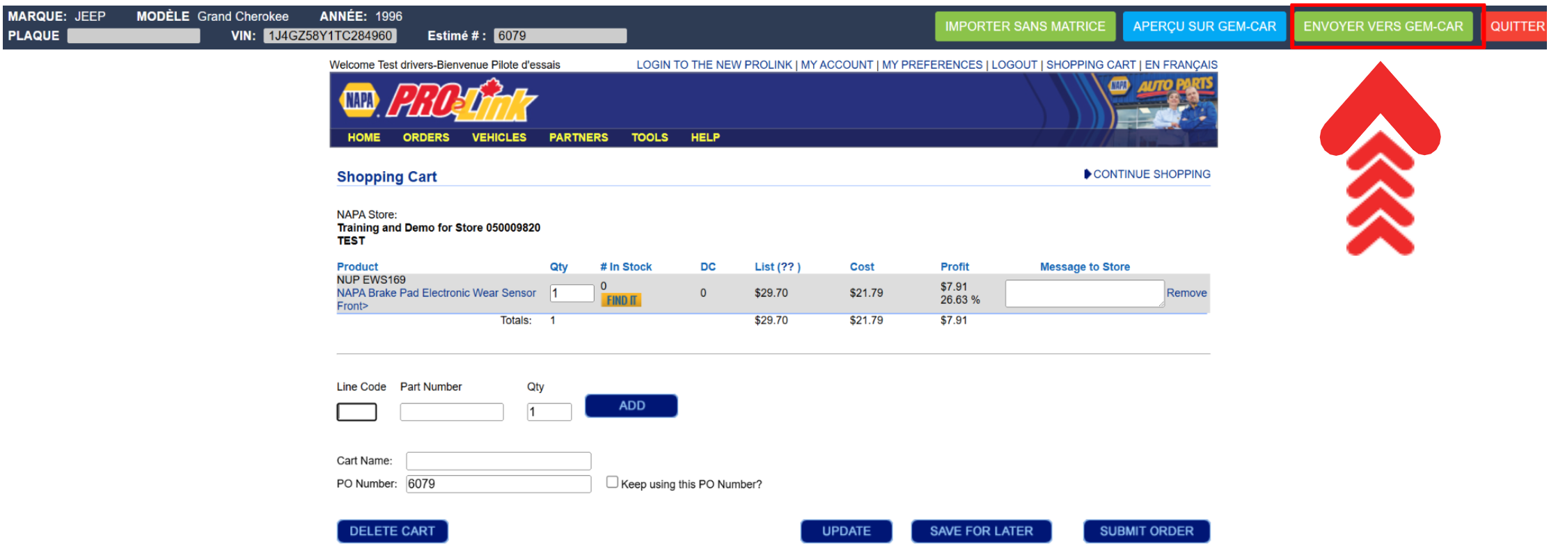 Après avoir sélectionné les produits et les avoir ajoutés à votre panier, si vous appuyez sur le bouton vert Envoyer vers GEM-CAR, dans le coin supérieur droit de l'écran, les produits seront envoyés au Point de vente au prix coûtant indiqué sur le site web du fournisseur.