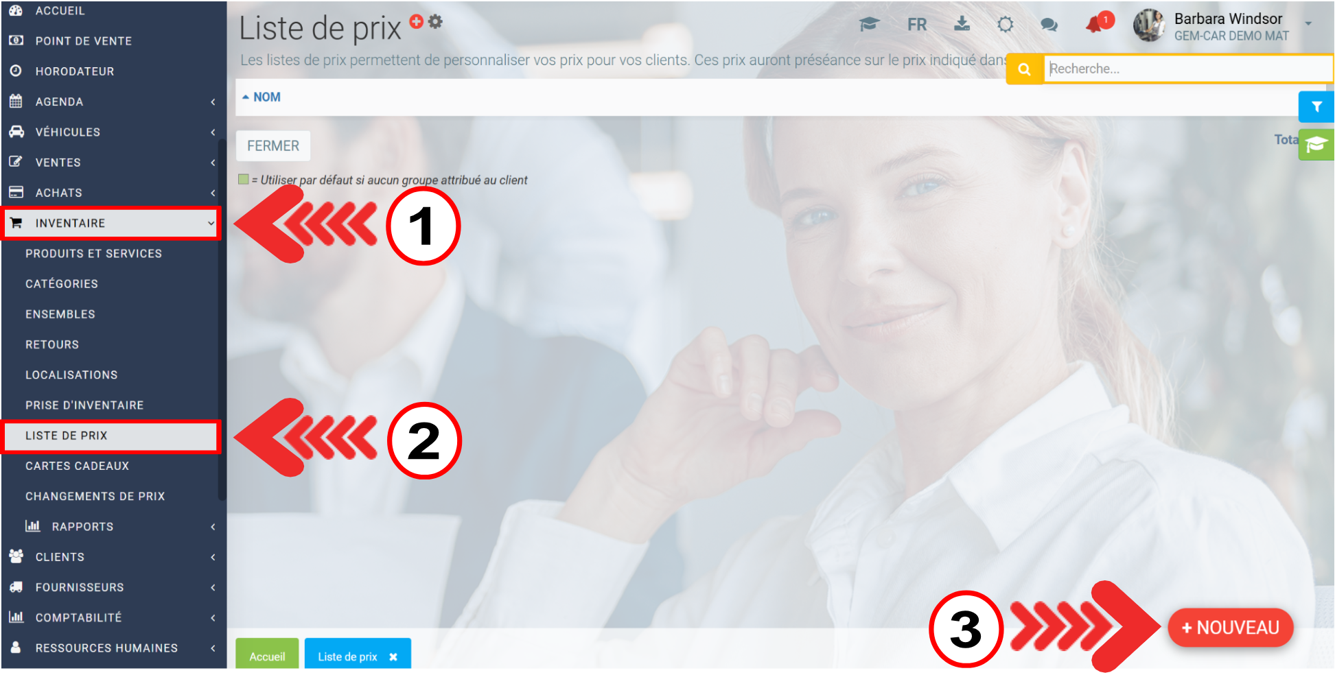 Pour créer une liste de prix, dans le menu de gauche, cliquez sur Inventaire > Liste de prix > +Nouveau.