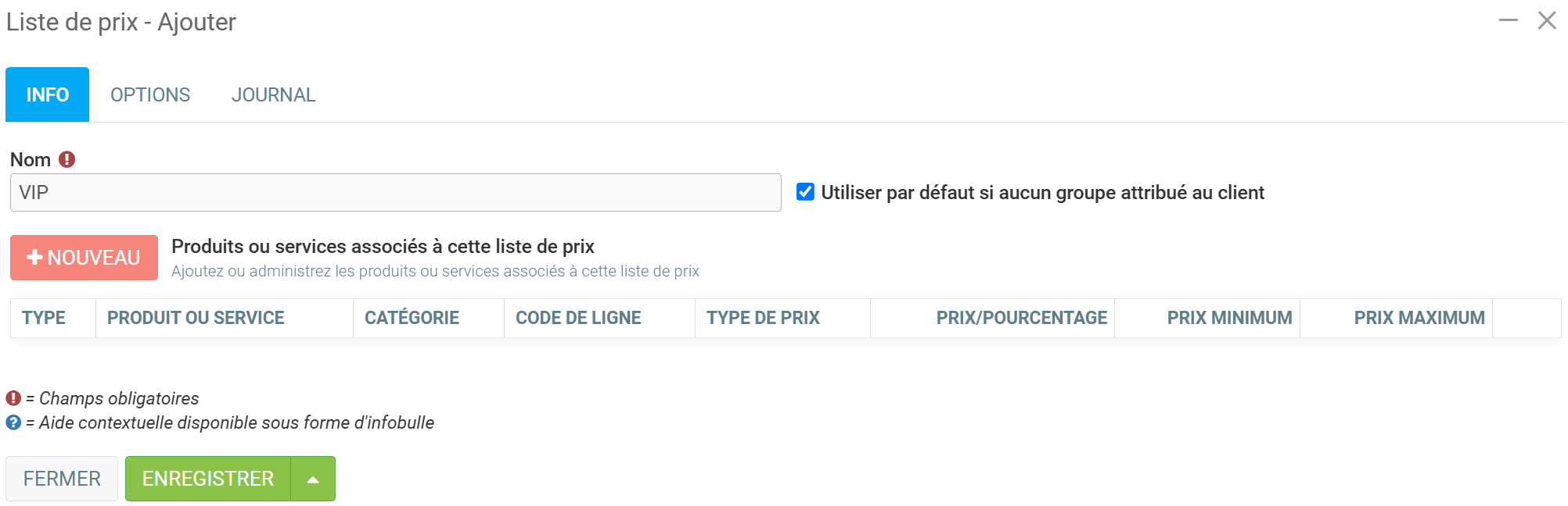 Saisissez le Nom et cochez la case "Utiliser par défaut si aucun groupe attribué au client".