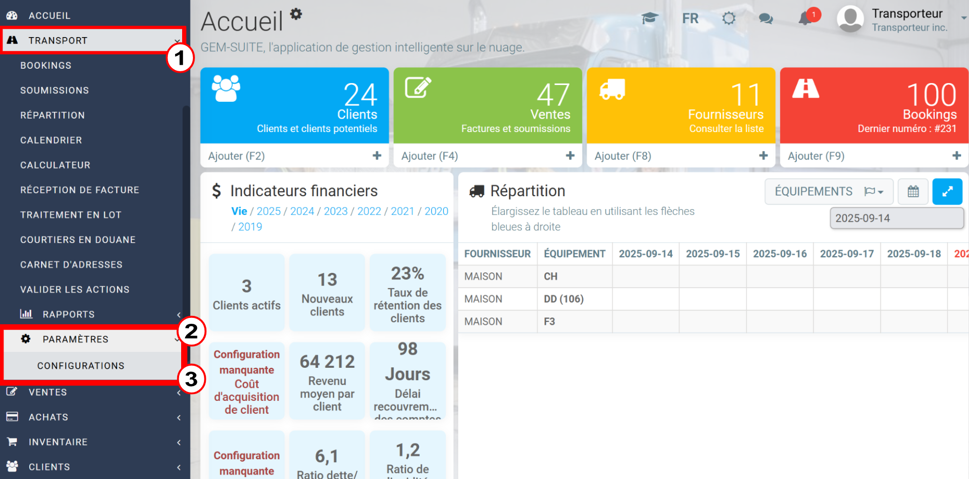 Pour configurer l'envoi, dans le menu de gauche, cliquez sur Transport > Paramètres > Configurations.