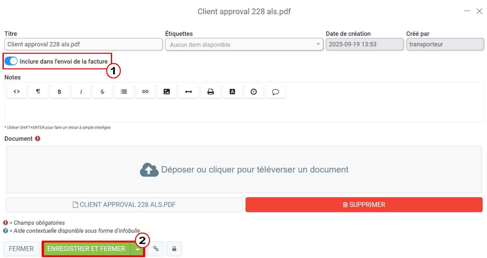 Sous le titre, cochez l'option Inclure dans l'envoi de la facture et cliquez sur Enregistrer et fermer.