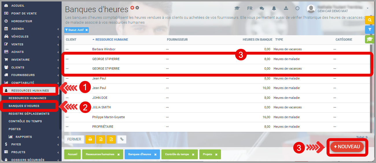 Sélectionnez l'employé et son type de banque d'heures que vous voulez modifier ou cliquez sur +Nouveau pour en créer une nouvelle.