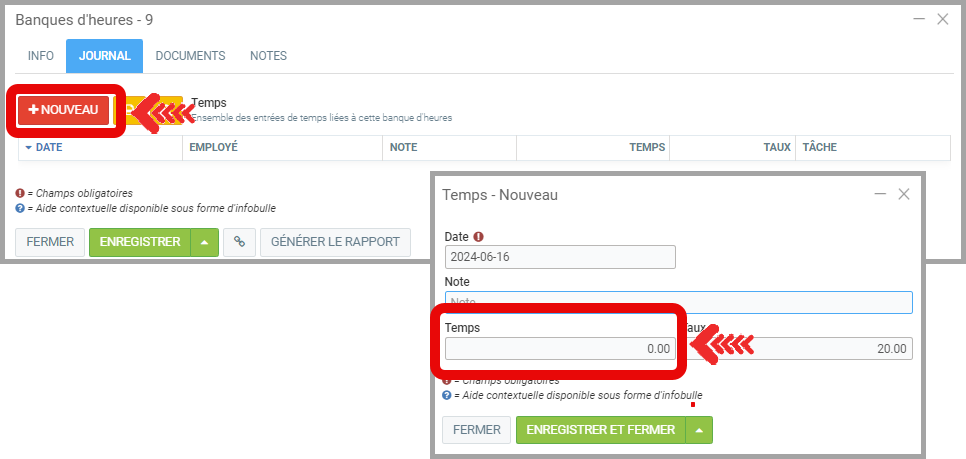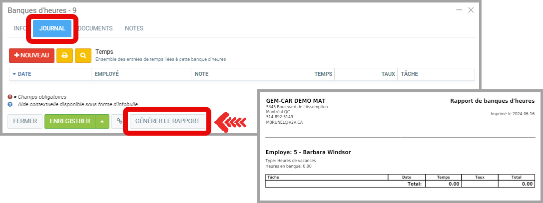 Notez que vous pouvez en tout temps Générer le rapport de la banque d'heures à partir du Journal.
