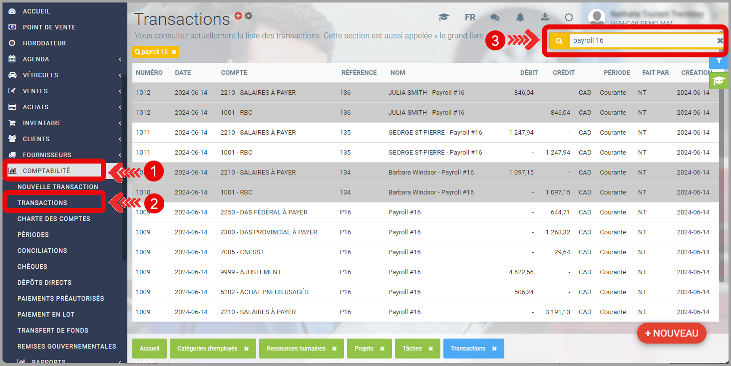 - Utilisez le filtre de recherche situé en haut à droite, inscrivez "payroll" et le numéro de la période de paie pour retrouver toutes les transactions y étant associées.
