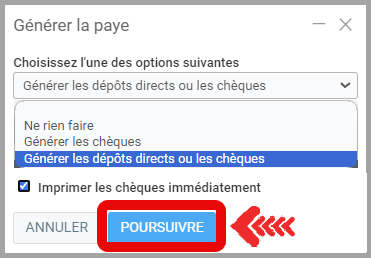 Vous pouvez maintenant choisir de générer des Dépôts Directs ou des Chèques pour payer vos employés.