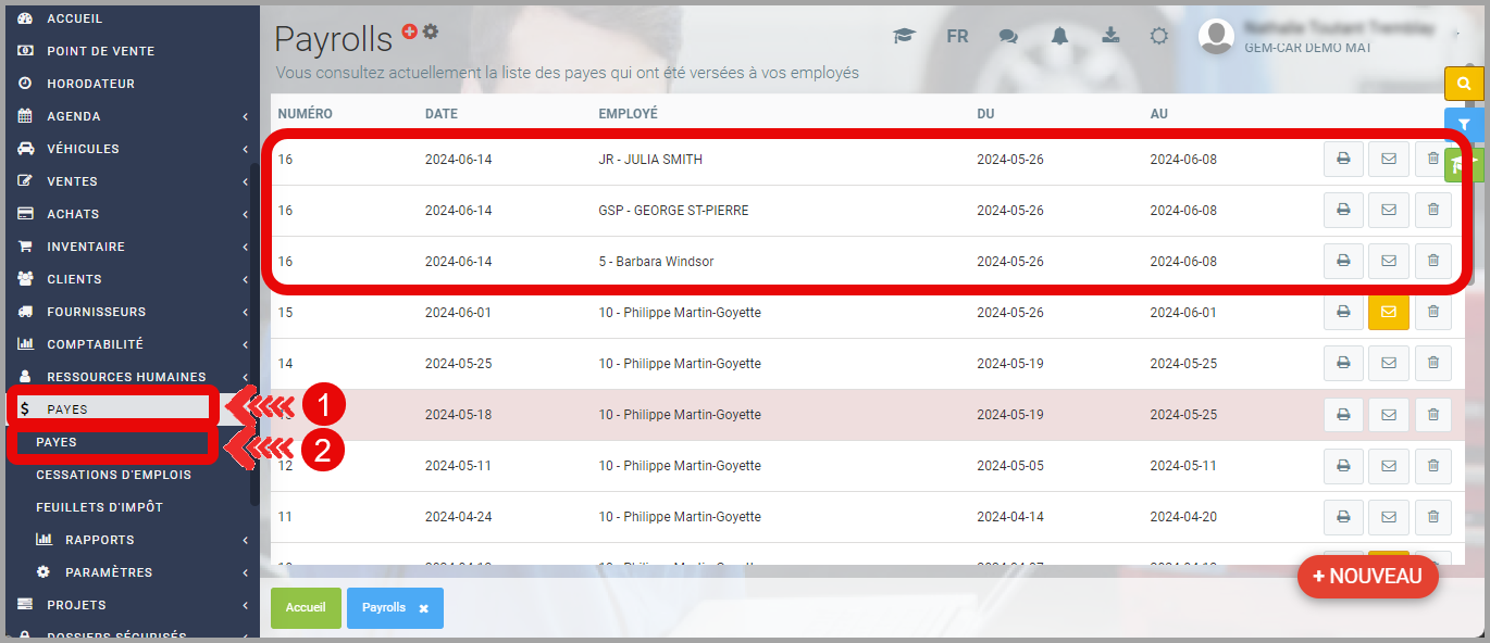 - Pour accéder aux copies des chèques générés, naviguez vers Payes > Payes. Vous les trouverez listés à cet endroit.