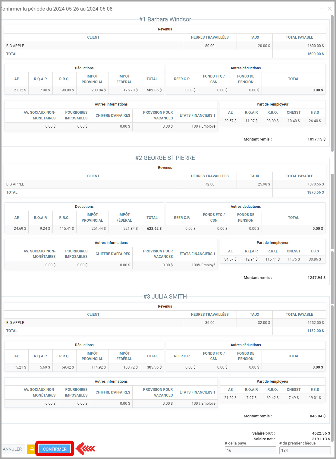 Le rapport présentera, pour chaque employé, un résumé des heures travaillées, du salaire, des déductions et d'autres informations pertinentes.