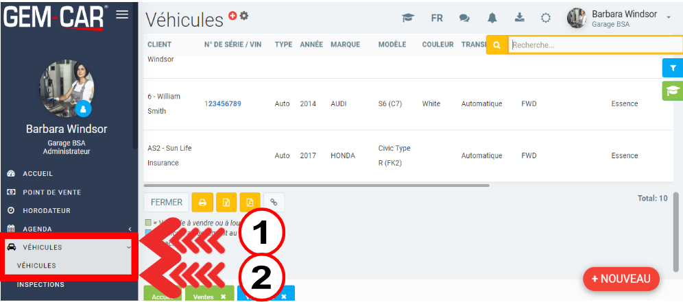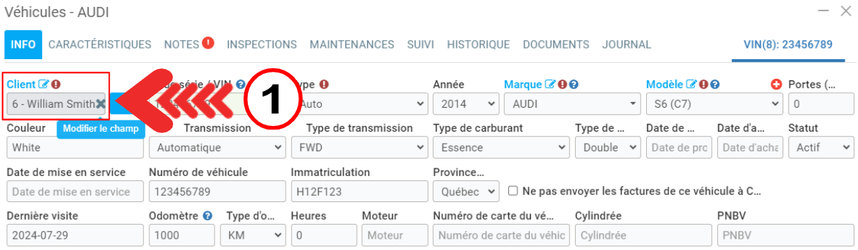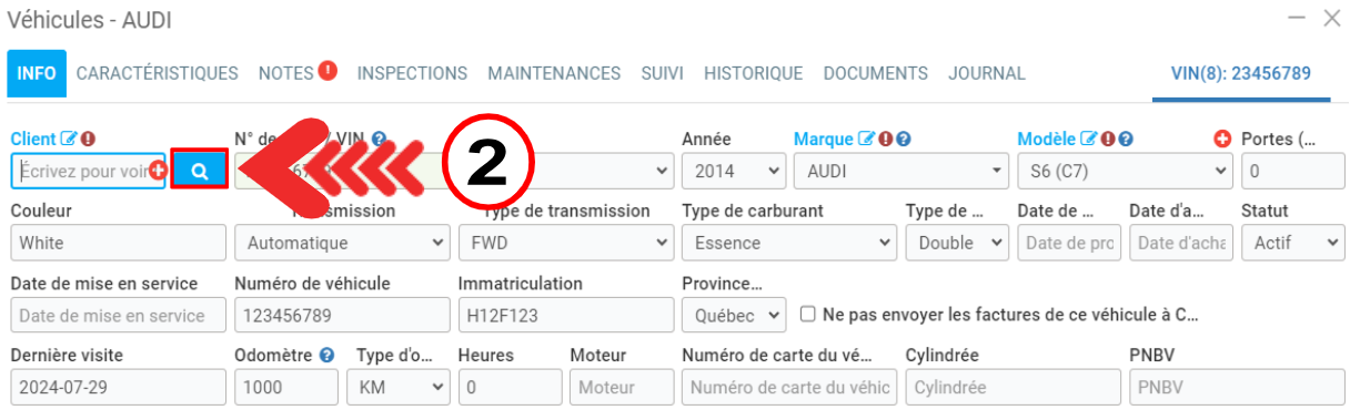 - ajouter un autre client au dossier du véhicule en cliquant sur la loupe puis en sélectionnant un client ou en créant un +Nouveau client.