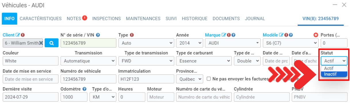 - pour supprimer le lien entre un client et un véhicule si vous ne connaissez pas le nouveau propriétaire, vous pouvez simplement rendre le véhicule Inactif.