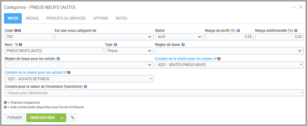 Nous vous recommandons de créer 2 catégories, Pneus neufs (auto) et Pneus neufs (camion) afin de faciliter le processus de remplacement de pneus par des neufs et le paiement des droits spécifiques. Voir Configuration des droits spécifiques sur les pneus neufs pour plus de détails.