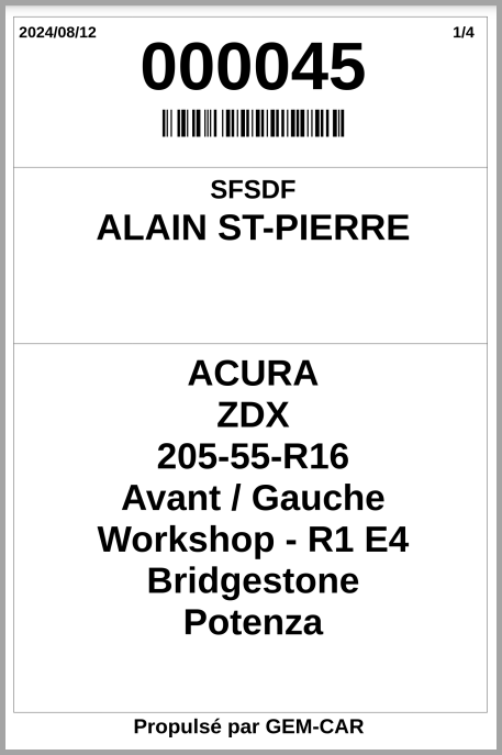 Vous obtiendrez 4 étiquettes comprenant les informations sur les pneus et sur le client concerné.