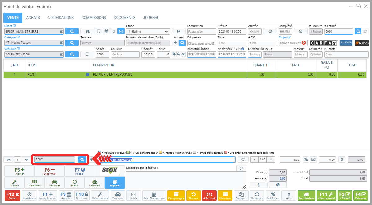 Pour sortir des pneus d'un client de l'entreposage, à partir du Point de Vente, entrez le code de produit RENT. Il s'agit du code de produit configuré par défaut pour le retour de pneus. Appuyez ensuite sur la touche ENTER.